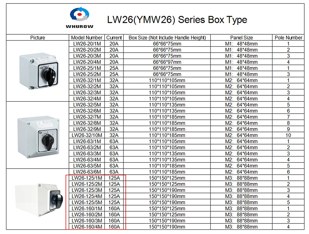 YAMING, en erfaren producent med over 30 års ekspertise inden for fremstilling af elektriske afbrydere, præsenterer LW26 125A 160A Waterproof Box Cam Switch (intern model: YMW26-125M 160M) udstyret med et vandtæt kabinet. Den kan prale af fremragende tilpasningsevne til forskellige arbejdsforhold, alsidige funktioner og høj sikkerhedsydelse, hvilket gør den til et ideelt valg til kredsløbsstyring, motorstyring, testudstyr og hovedkontrolscenarier.